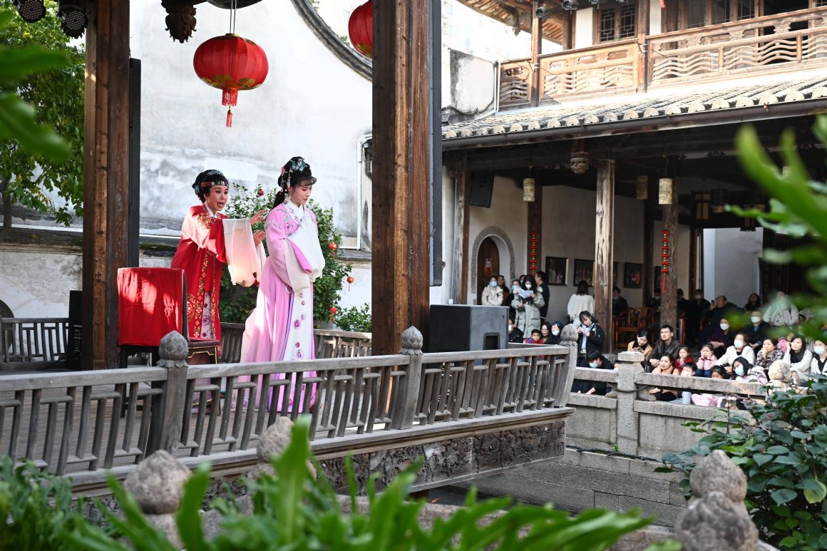 1月27日,游客在福州三坊七巷水榭戏台观看越剧。新华社记者 林善传 摄