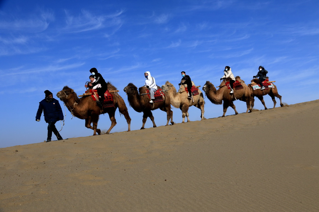 1月27日,游客在甘肃省敦煌市鸣沙山月牙泉景区骑骆驼游览。新华社发(张晓亮 摄)