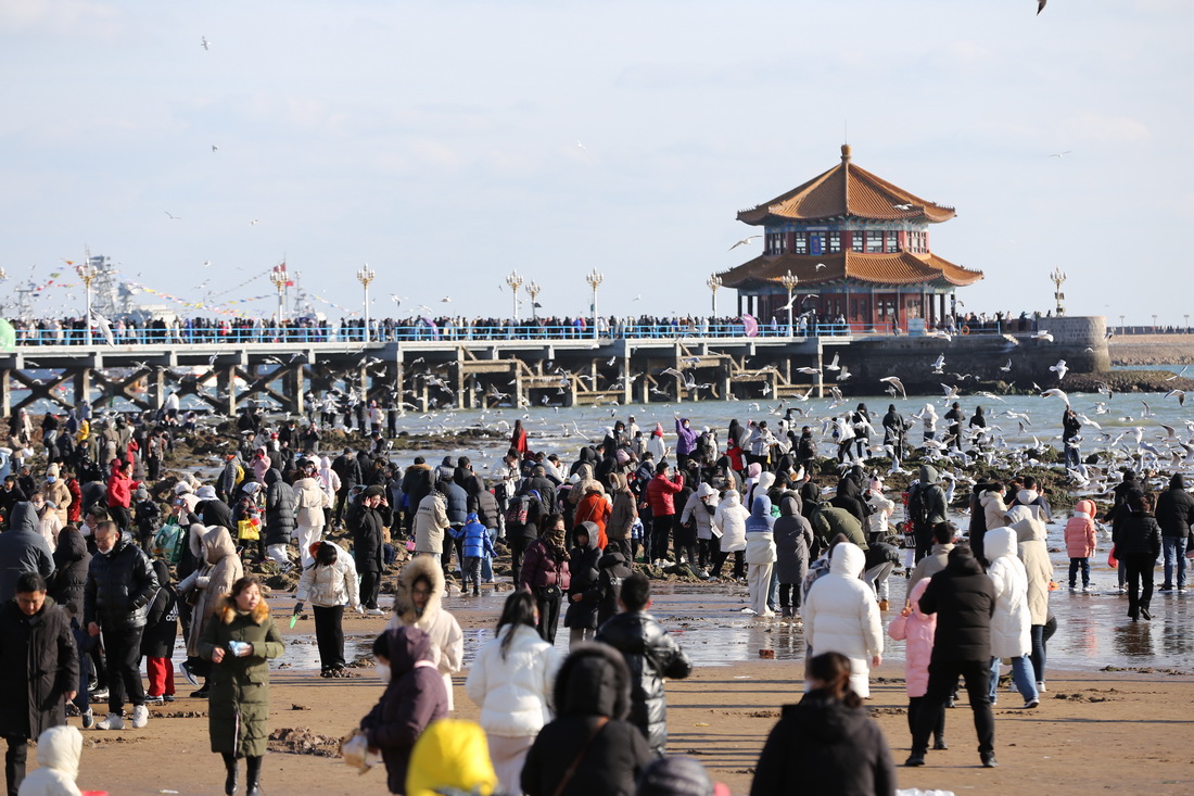 1月25日,游客在山东省青岛栈桥风景区游玩。新华社发(黄杰显 摄)