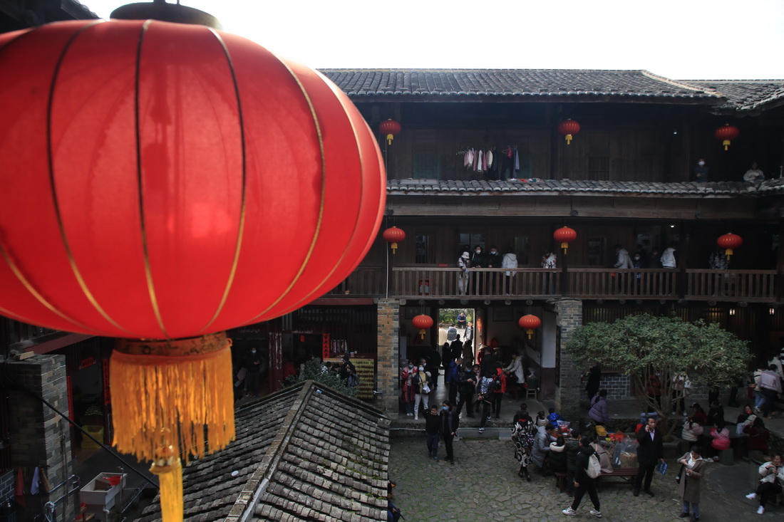 1月25日,游客在福建省龙岩市永定区土楼景区游玩。新华社发(周杨东 摄)