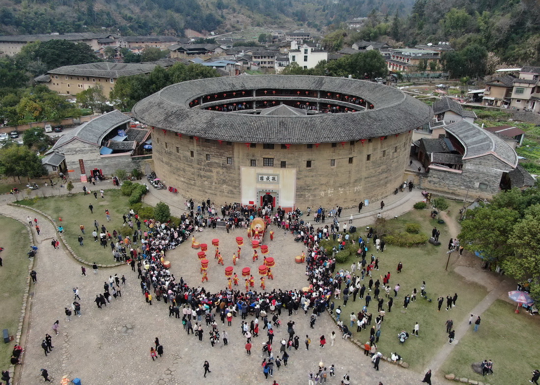 1月25日,游客在福建省龙岩市永定区土楼景区观看民俗表演(无人机照片)。新华社发(周杨东 摄)