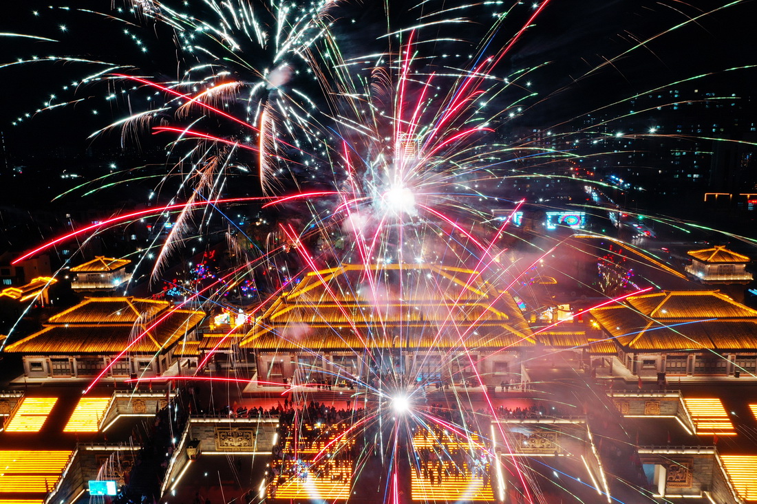 1月27日晚,游客在山东省郯城县郯国古城景区观赏烟花(无人机照片)。新华社发(张春雷 摄)