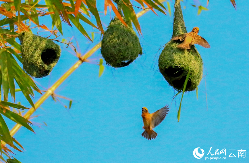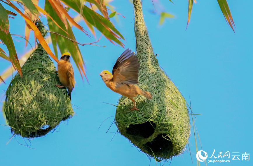 人民网普洱4月17日电 4月中旬,大批黄胸织布鸟回到云南省普洱市孟连县筑巢安家,繁育后代。黄胸织布鸟因其巢穴做工十分精美,被誉为“动物界最美纺织工”。