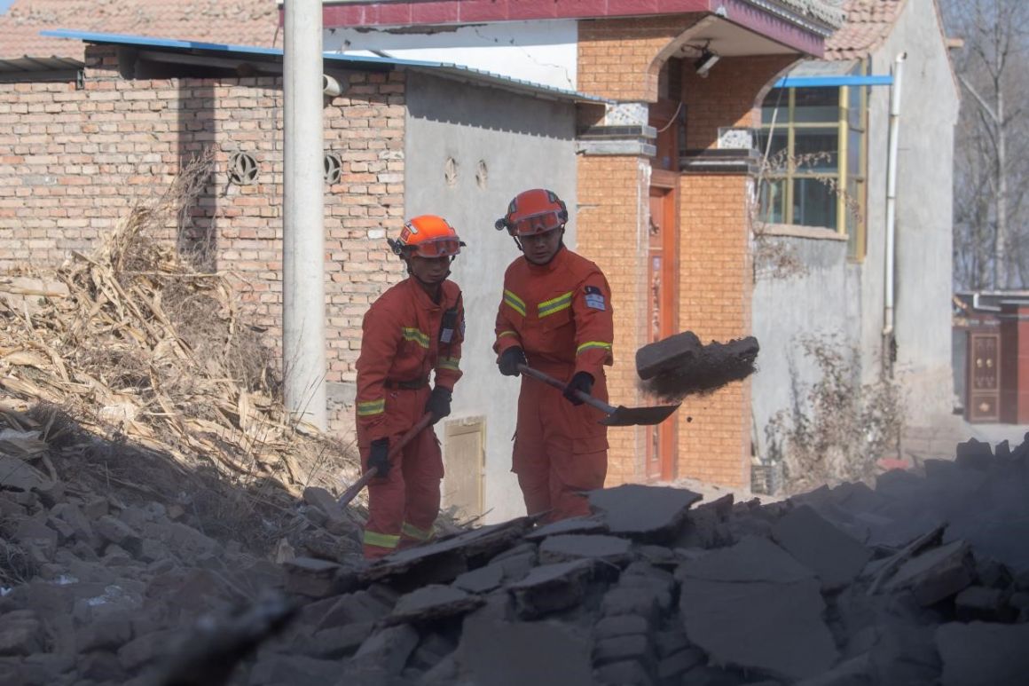 12月21日,在积石山县石塬镇石塬村,消防救援人员正在清理村中道路。