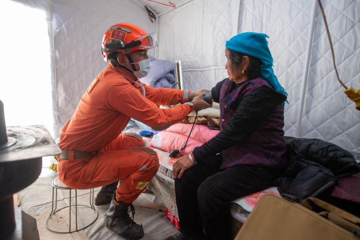 12月21日,在积石山县石塬镇石塬村安置点,消防救援队卫生员正在为身体不适的群众测量血压。