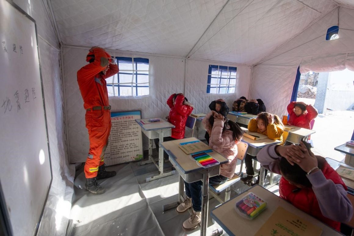 12月21日,在积石山县石塬镇石塬村安置点,消防救援人员正在给小学生们讲授地震避险常识。