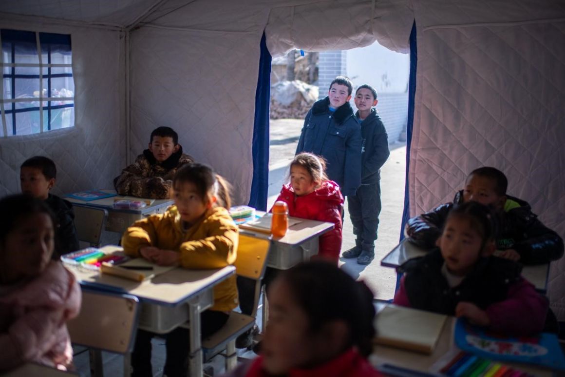 12月21日,在积石山县石塬镇石塬村安置点,地震避险科普小课堂吸引了不少小朋友前来听课学习。