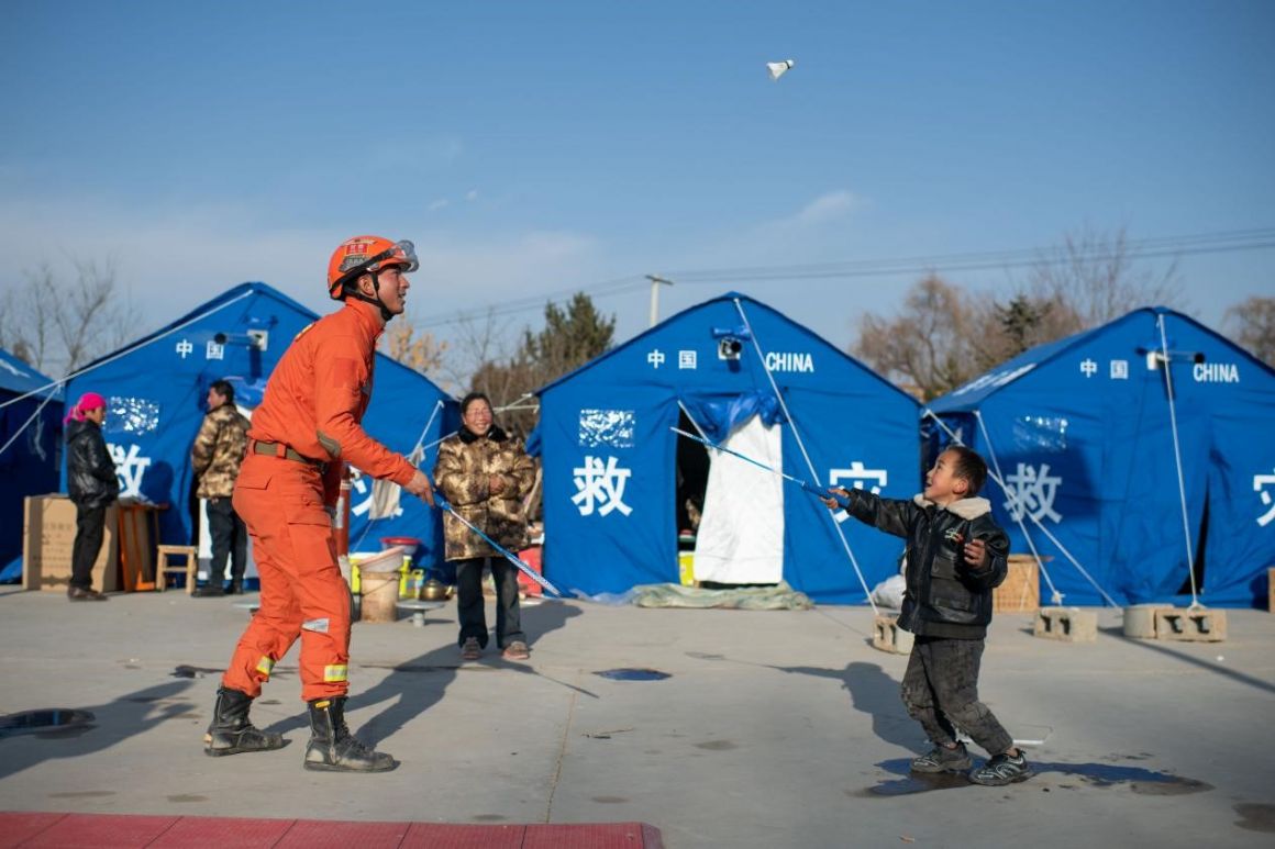12月21日,在积石山县石塬镇石塬村安置点,消防救援人员忙里偷闲教小朋友打羽毛球。