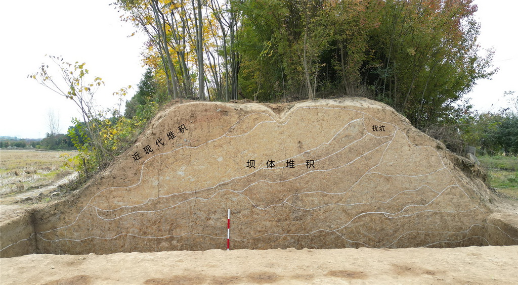 湖北荆门屈家岭遗址郑畈水坝剖面清理情况。新华社发(全国十大考古新发现活动办公室供图)