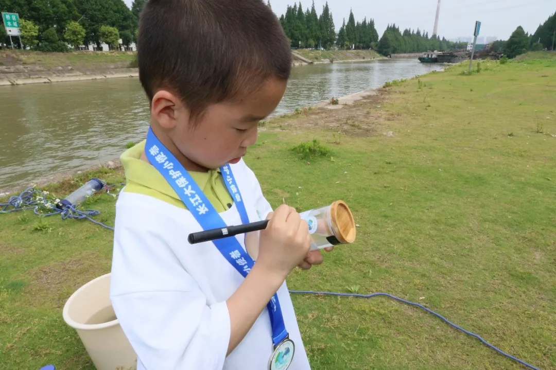 靖江市外国语学校小使者正在“江豚瓶”认真写下水样采集信息