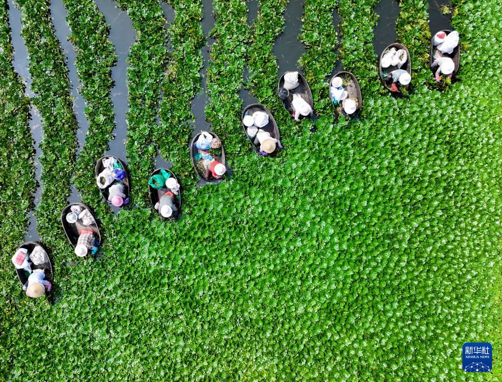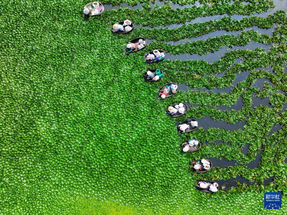8月6日,在江苏省淮安市洪泽区岔河镇,农民在采摘菱角(无人机照片)。新华社发(殷潮摄)