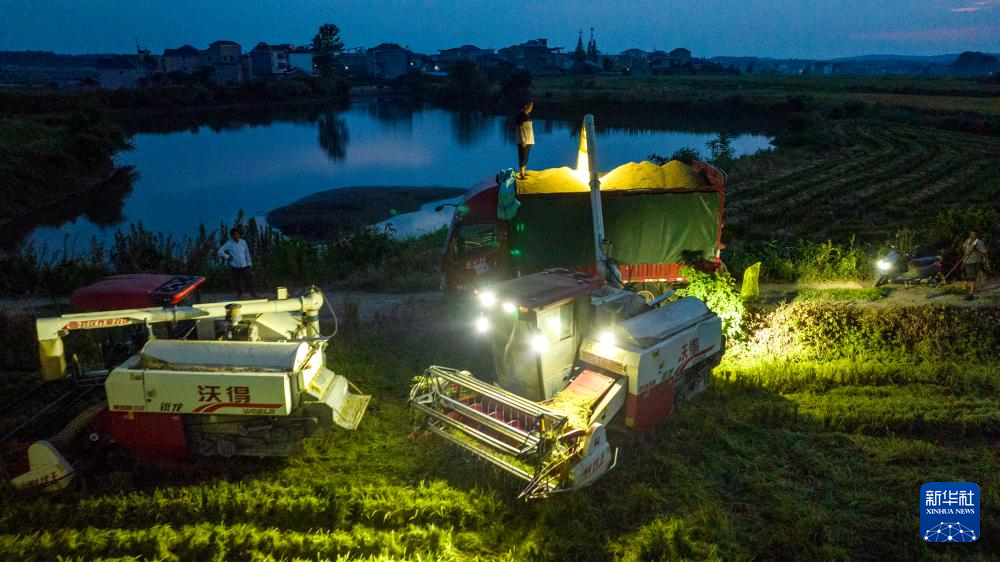 8月5日,在江西省九江市都昌县蔡岭镇杨湾村,农机手将收获的水稻装车转运(无人机照片)。新华社发(傅建斌摄)