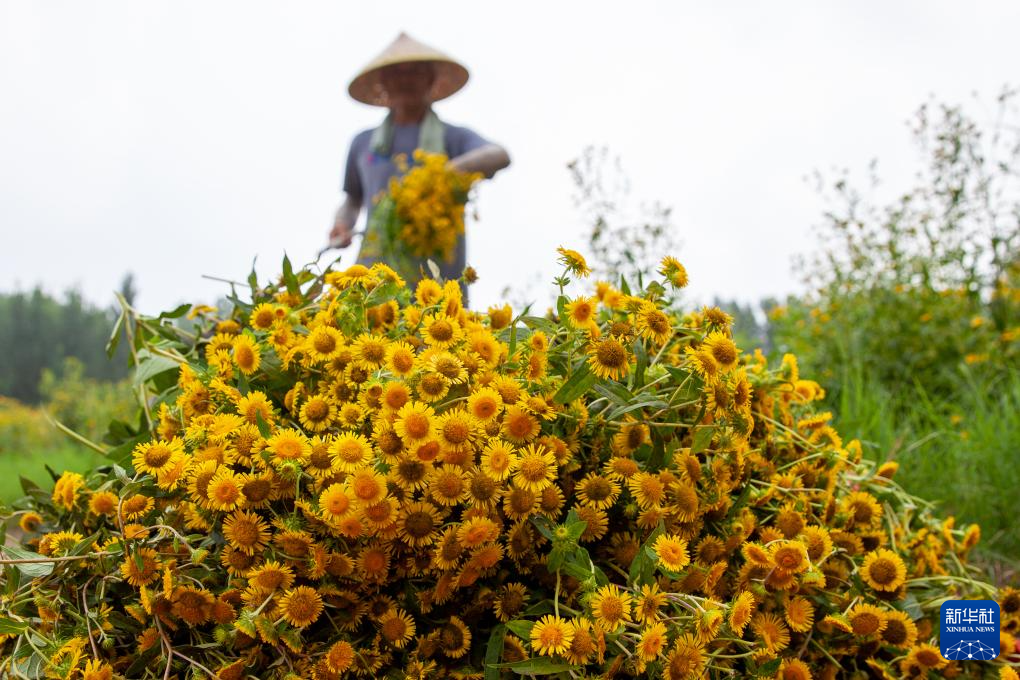 8月6日,农民在山东省淄博市高青县黑里寨镇采收中药材。新华社发(张维堂摄)