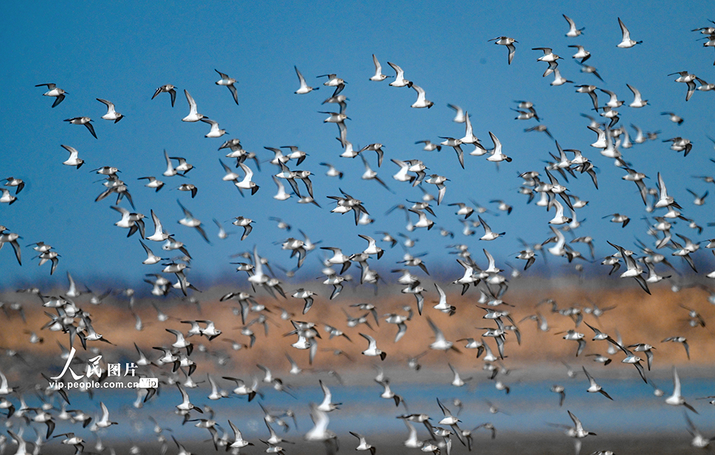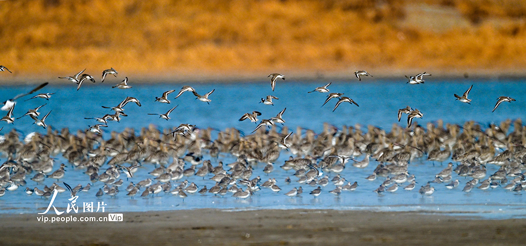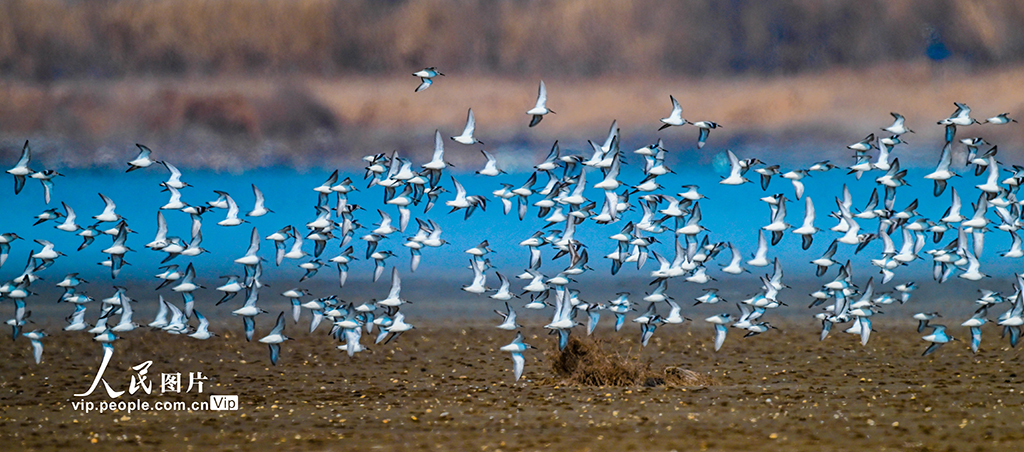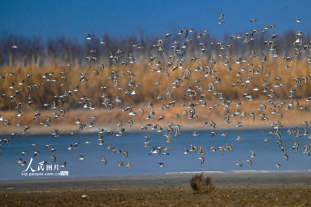 2025年3月2日,江苏东台条子泥湿地迎来了万鸟翔集的壮丽景象,群鸟振翅高飞,蔚为壮观,构成了一幅令人震撼的自然生态画卷。孙家录摄(人民图片网)