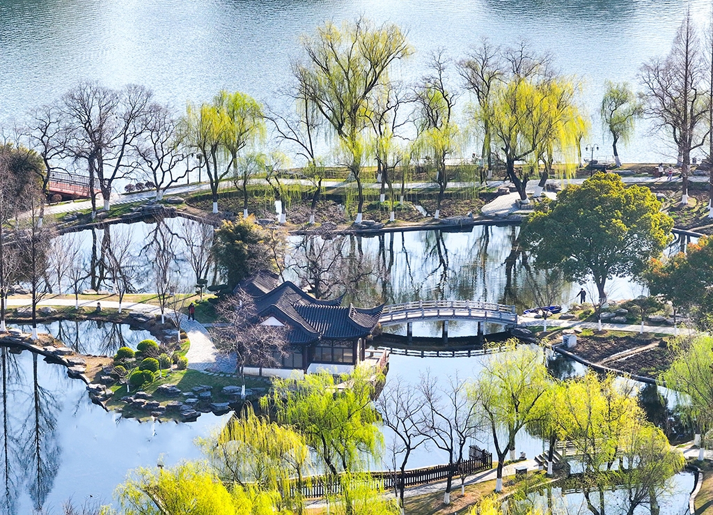 2025年3月18日,江苏省南京市莫愁湖公园内,柳枝吐露新绿,春色满园,宛如一幅动人的画卷。方东旭摄(人民图片网)