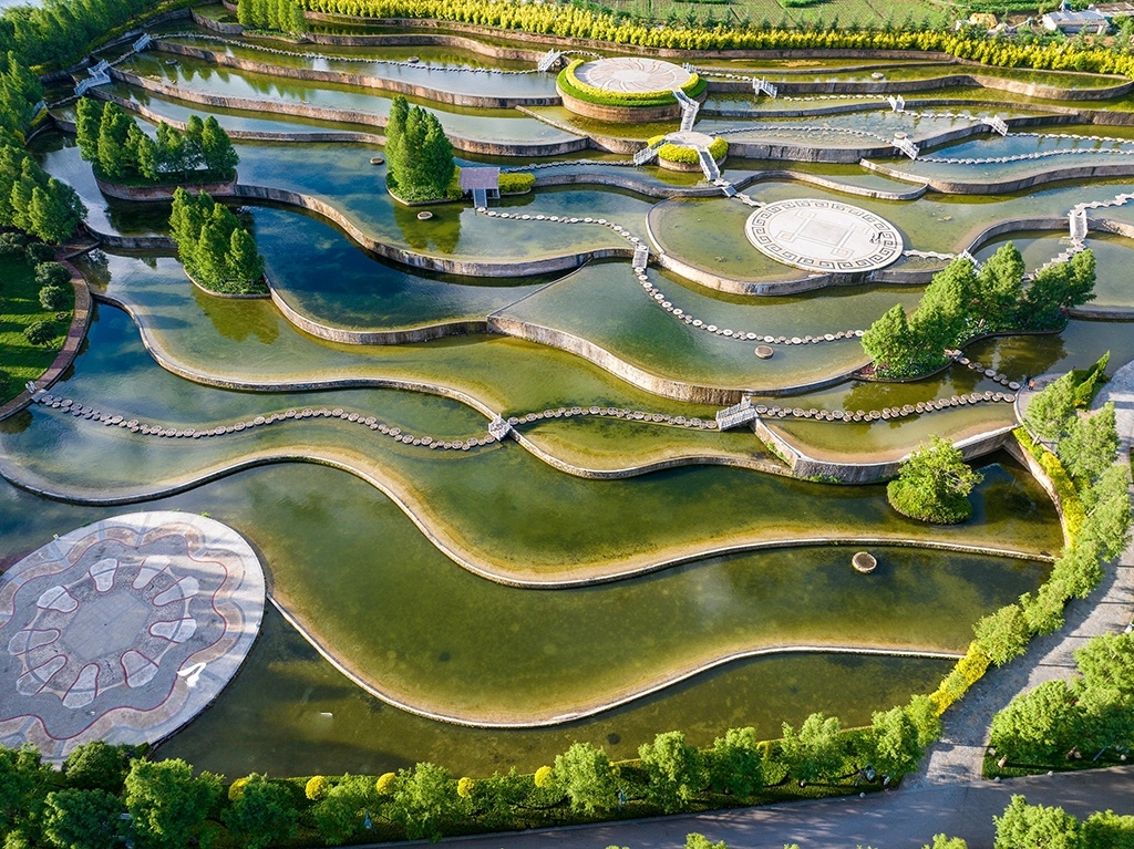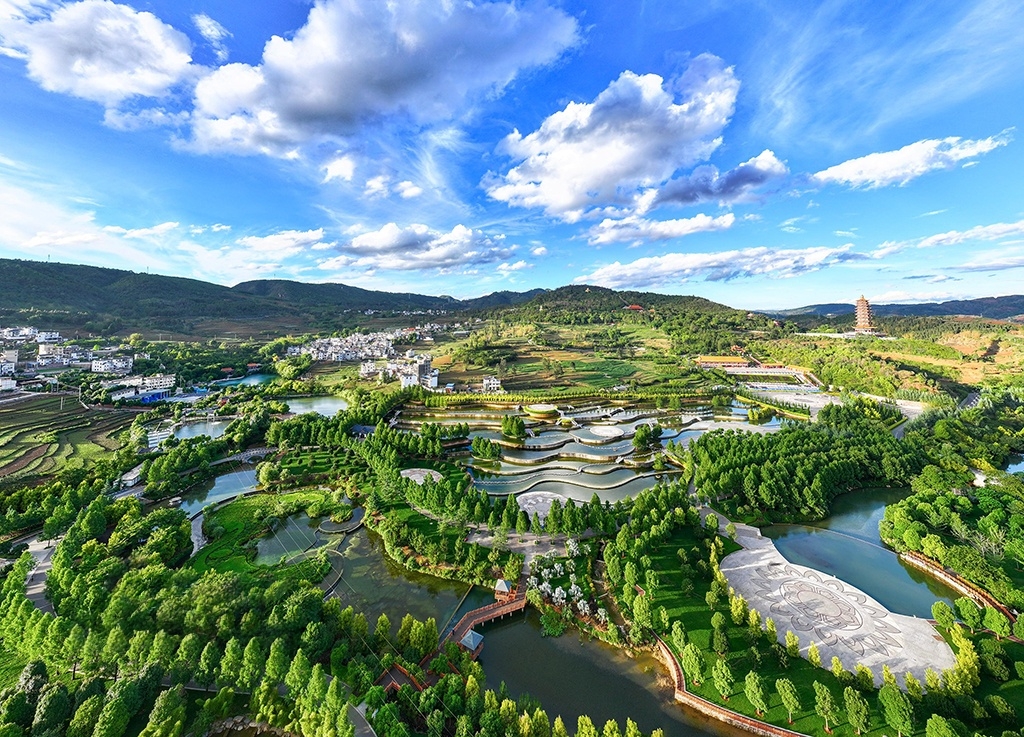 2025年5月30日,云南省红河州弥勒市五彩云池湿地公园,绿树环绕,湖面如镜,与民居、天空、白云相映成趣,构成了一幅美丽的生态画卷,美不胜收。何华文摄(人民图片网)