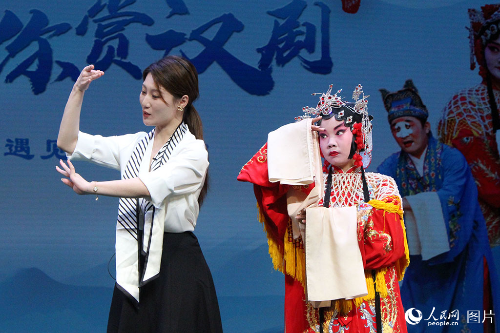 2025年5月28日,在武汉人民剧院,湖北省蕲春县第二实验小学余凉校区的学生在老师的指导下,学习简单的汉剧动作。人民网记者 张沛摄