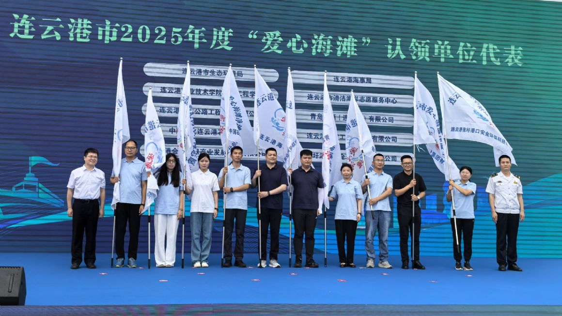 为连云港市2025年度“爱心海滩”认领单位代表授旗,并启动了净滩活动。