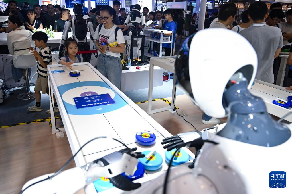 7月29日,小朋友在和一款机器人玩冰壶游戏。