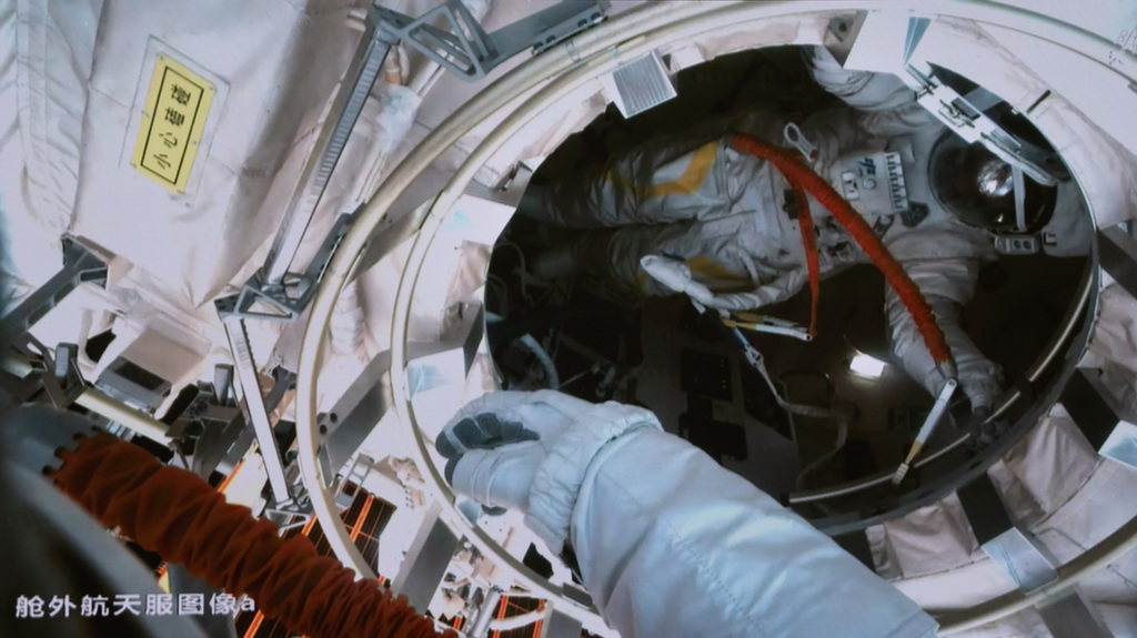 这是9月25日晚在北京航天飞行控制中心屏幕上拍摄的神舟二十号乘组航天员王杰出舱的画面。新华社记者 李明刚 摄