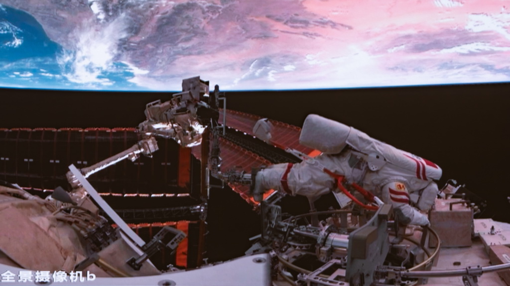 这是9月25日晚在北京航天飞行控制中心屏幕上拍摄的神舟二十号乘组航天员王杰在空间站组合体舱外作业的画面。新华社记者 李明刚 摄