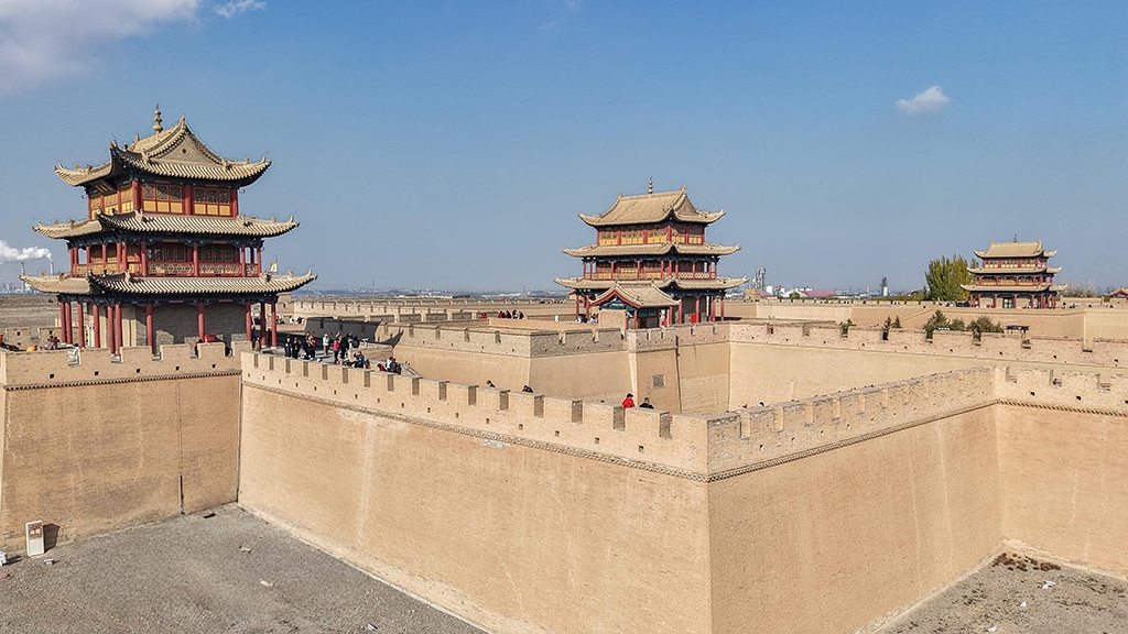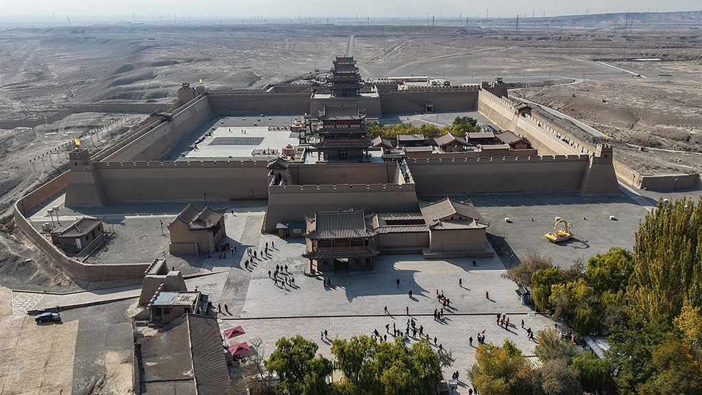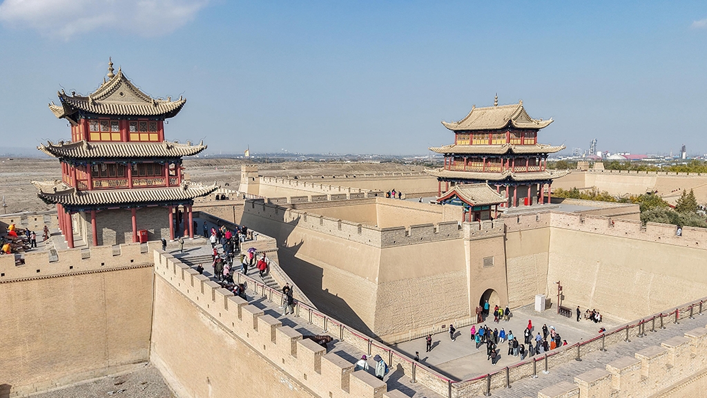 2025年10月16日,甘肃省嘉峪关市关城景区,游客登上城楼领略大漠雄关的壮阔美景。陈坤摄(人民图片网)