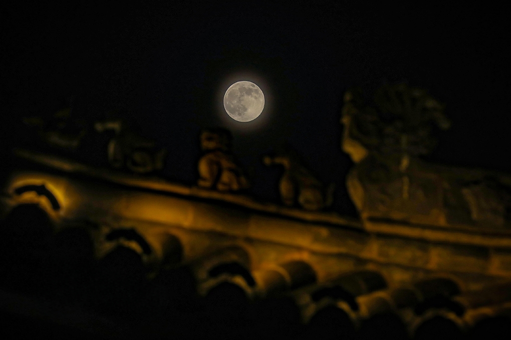 2025年11月5日晚,一轮“超级月亮”升起在山西省长治市武乡县夜空,与古塔、建筑相映成趣。李勇摄(人民图片网)