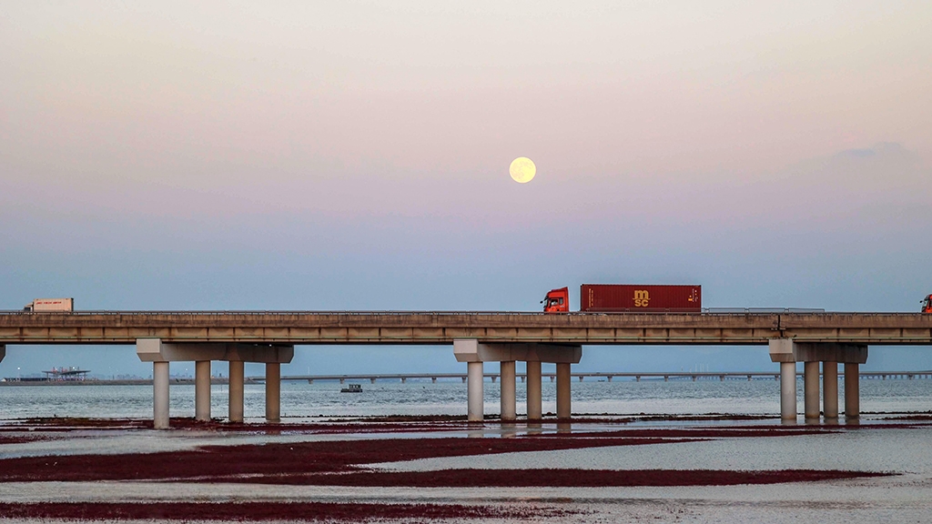 2025年11月5日,在山东省青岛市西海岸新区,“超级月亮”与海湾大桥交相辉映。韩加君摄(人民图片网)