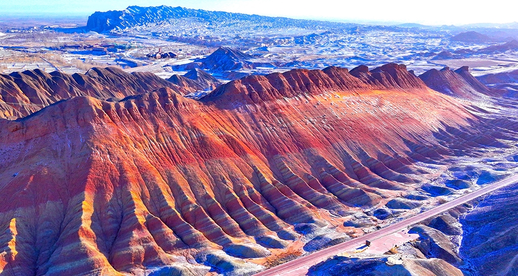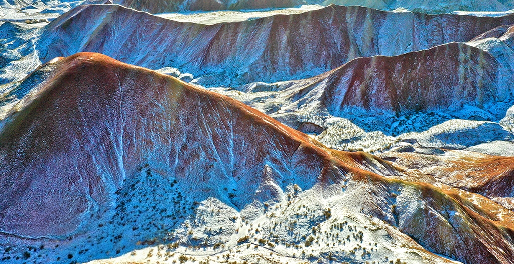 2025年11月24日,雪后初晴,在甘肃省张掖市七彩丹霞旅游景区,白雪与丹霞交相辉映,呈现出“雪浴丹霞”美景,尽显大自然神奇魅力。王将摄(人民图片网)