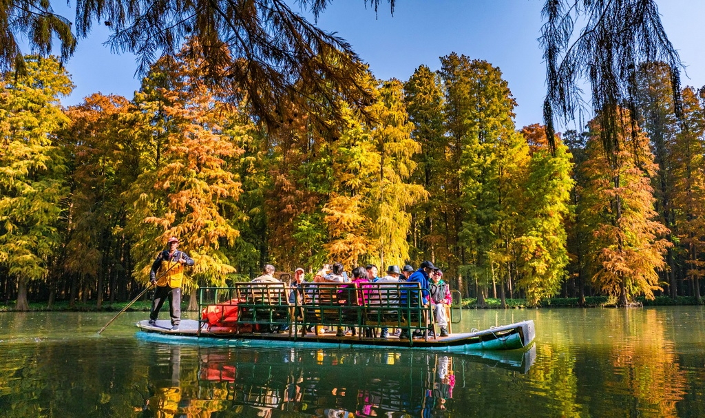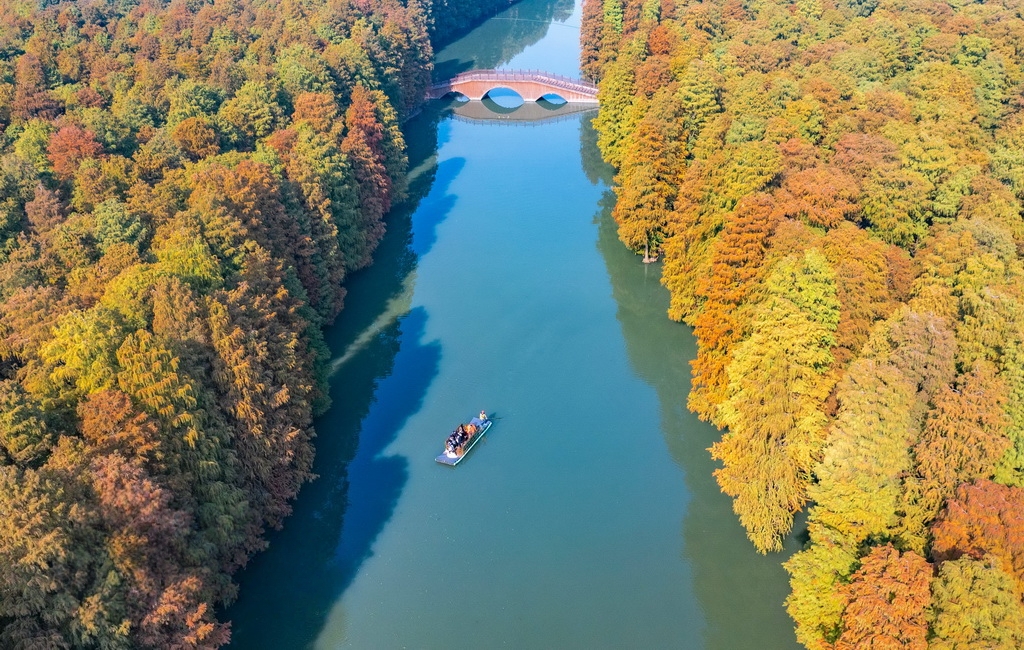 初冬时节,江苏兴化里下河国家湿地公园层林尽染、色彩斑斓,如画美景吸引不少游客前来游玩。周社根摄(人民图片网)