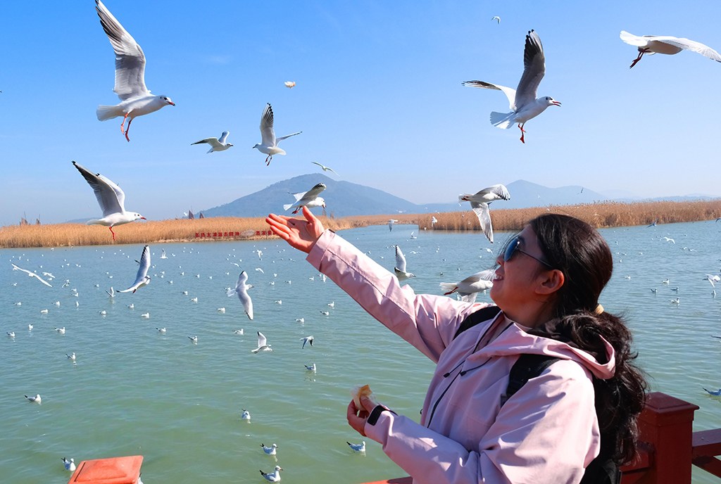 2026年1月14日,冬日暖阳中,大批红嘴鸥在江苏苏州吴中区光福镇太湖水域越冬觅食,翩跹飞舞,吸引众多游客前来赏鸥观景,人鸥相谐,构成一幅灵动的冬日生态图景。王建中摄(人民图片网)