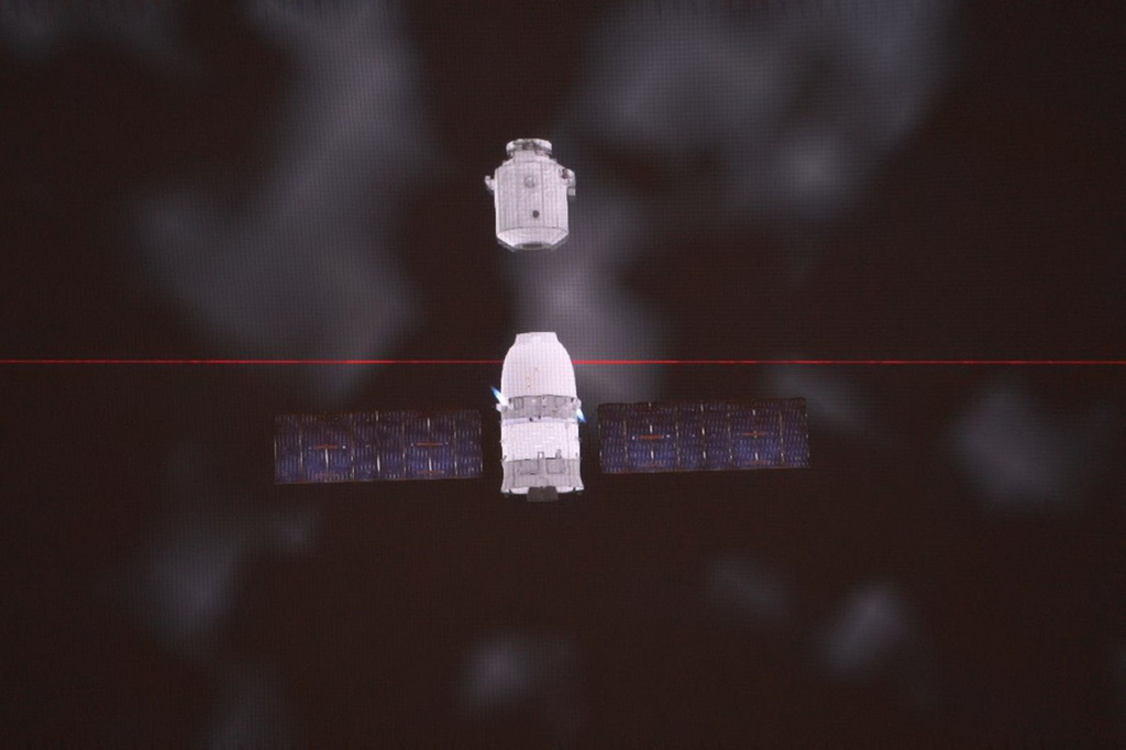 1月19日在北京航天飞行控制中心拍摄的神舟二十号飞船撤离空间站的模拟画面。新华社记者 王春涛 摄