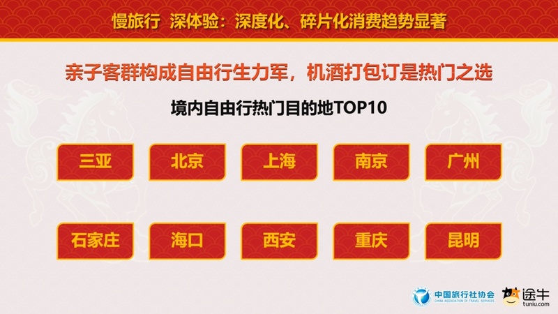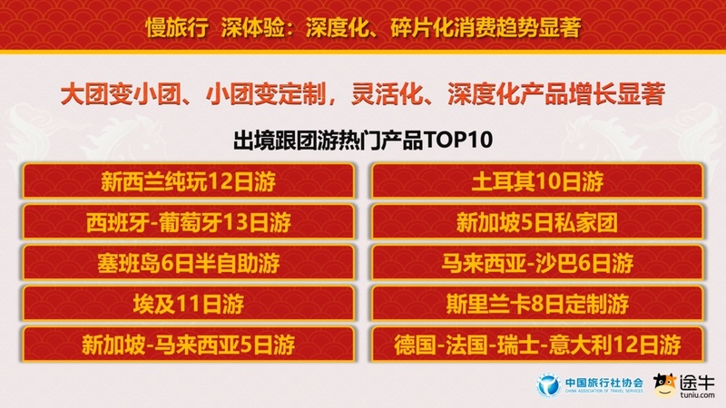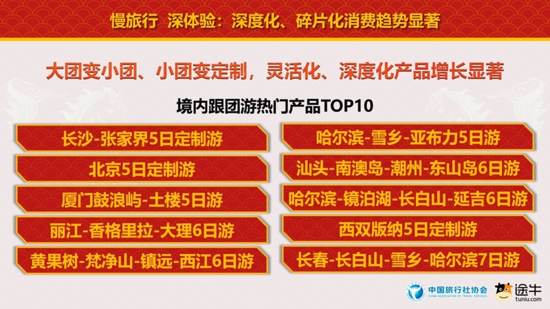 碎片化方面,自驾游、自由行、私家团、定制团、小团游等灵活、个性的打包旅游产品占比增长明显。途牛春节团期打包旅游产品预订中,周边游方向自驾游用户预订出游人次占比超85%,出境短线游方向自由行用户预订出游人次占比过半。