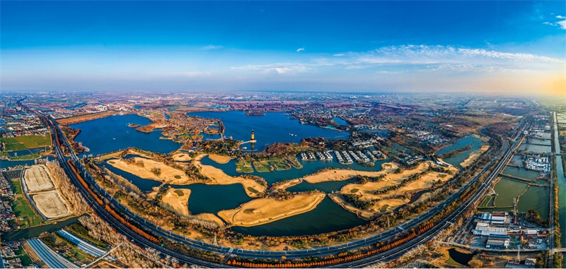 1月9日拍摄的泰州市姜堰区溱湖国家湿地公园,蓝天白云,碧水清波,树木色彩斑斓,美如画卷。许大才 薛春凤 摄 视觉江苏网供图