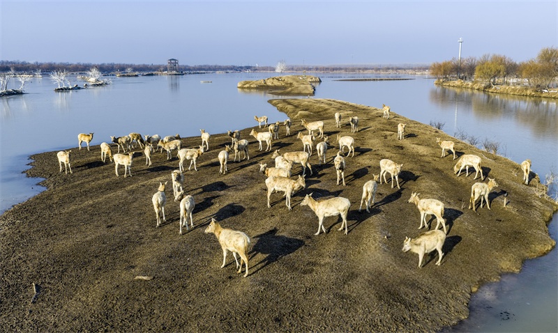 1月23日,麋鹿在江苏省大丰麋鹿国家级自然保护区黄海野鹿荡栖息、觅食。近年来,江苏省大丰麋鹿国家级自然保护区推进湿地修复,不断提高海岸带生态系统质量,境内的湿地生态系统日趋完善。计海新 摄 视觉江苏网供图