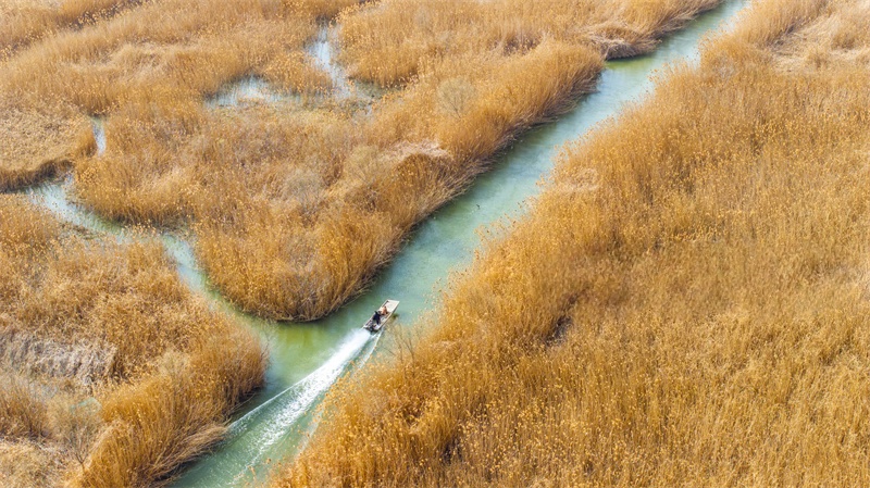 1月10日,泗洪洪泽湖湿地国家级自然保护区临淮段,芦苇摇曳、碧波荡漾,冬日风景宛如油画。近年来,泗洪县不断加大环境保护与修复力度,生态环境持续向好。周鹏 摄 视觉江苏网供图