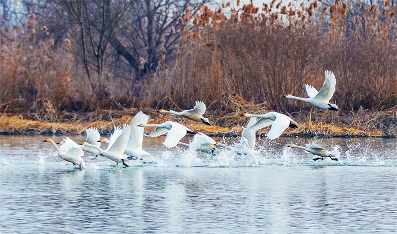 1月29日,一群小天鹅在金湖县马草滩湿地飞翔,在芦苇荡里上演一场“水上芭蕾”。近年来,当地持续推进湿地生态保护与修复工作,通过水质净化、植被修复等措施,为候鸟打造安全舒适的迁徙驿站。梁嘉庆 摄 视觉江苏网供图