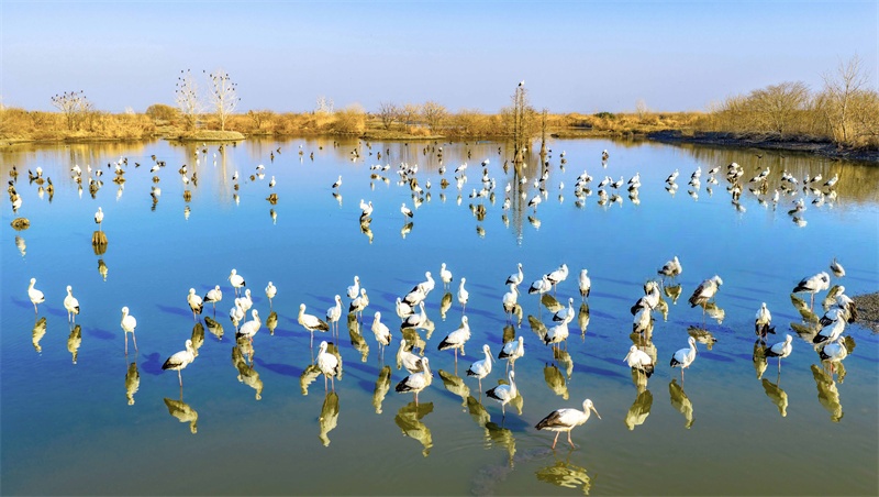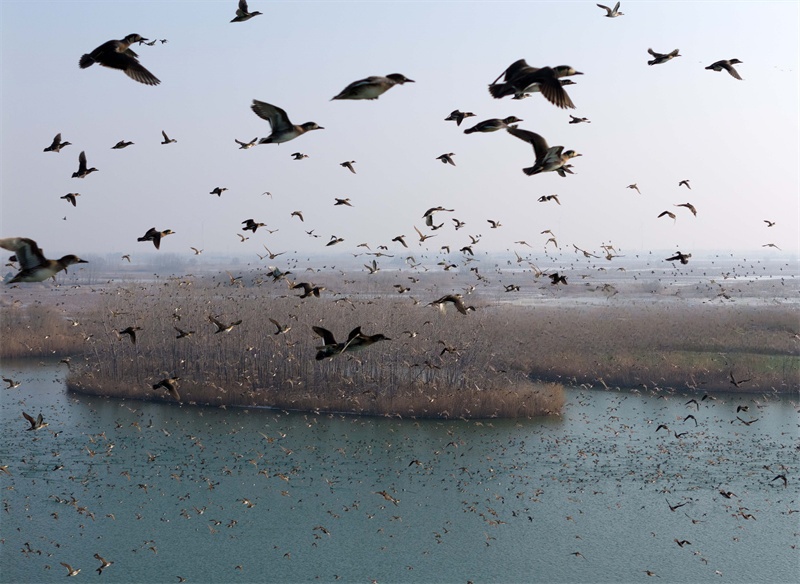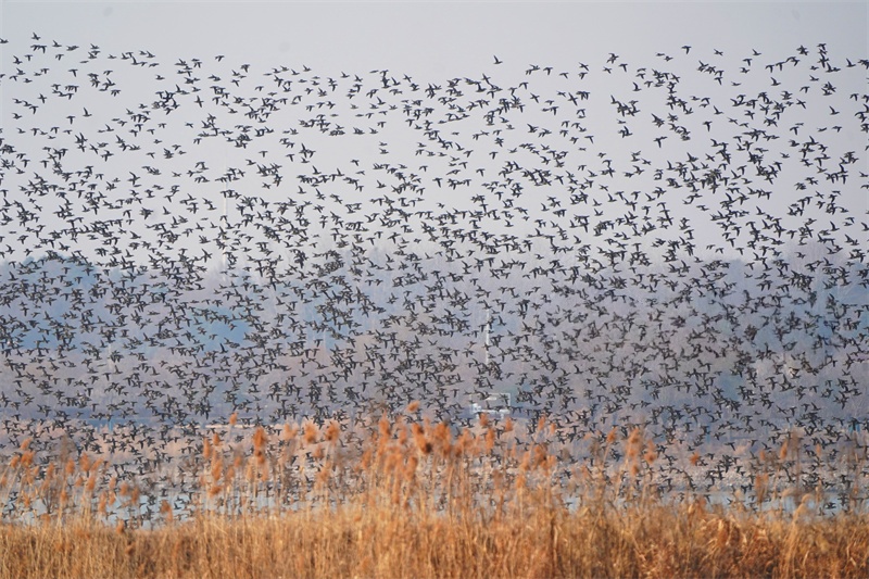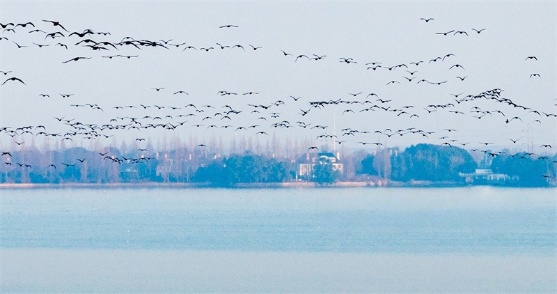 1月24日,淮安市白马湖国家湿地公园迎来候鸟栖息季,成群鸟类振翅飞翔。近年来,当地持续推进湿地生态修复与保护,改善候鸟栖息环境。贺敬华 摄 视觉江苏网供图