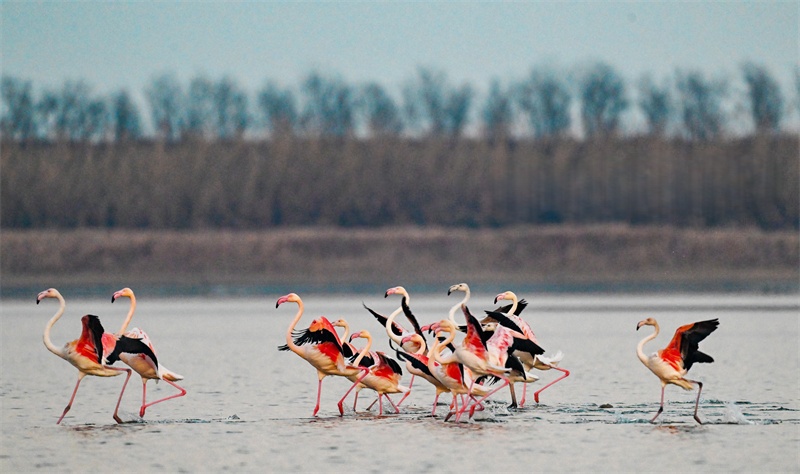 1月22日在东台条子泥湿地拍摄的火烈鸟。由于湿地生态持续向好,火烈鸟已连续11年来此越冬。孙家录 摄 视觉江苏网供图
