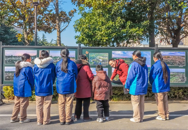 1月28日,泗洪县洪翔中学举办湿地摄影图片展,组织学生参观,感受湿地之美,迎接世界湿地日。张连华 摄 视觉江苏网供图