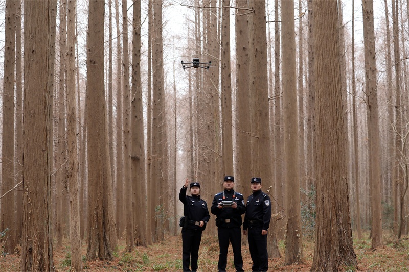 1月18日,宝应县公安局画川派出所组织民警、辅警,在宝应湖国家湿地公园的生态林用无人机巡查,强化林区巡查力度。沈冬兵 摄 视觉江苏网供图