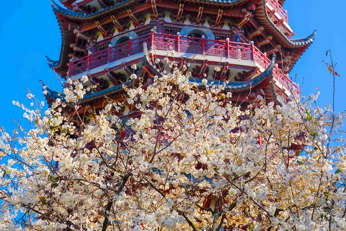 2026年2月10日,昆明盘龙区昙华寺公园内,素有“云南第一塔”之称的瑞应塔下,早樱如雪,簇簇探出枝头热烈绽放。周毓焱摄(人民图片网)