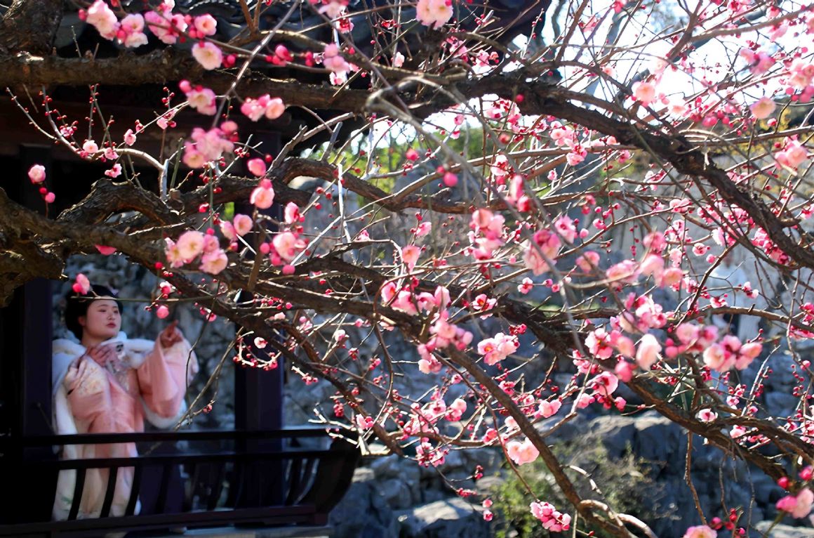 2026年2月8日,江苏苏州天气晴好,古典园林艺圃内梅花盛开,吸引众多游客前来观赏,或拍照留影,或漫步其中。王建康摄(人民图片网)
