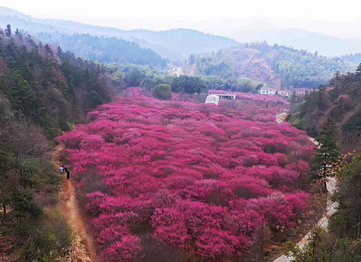 2026年2月11日,浙江长兴县和平镇城山村,漫山梅花盛开,与远山、村落相映,景致如画。方金华摄(人民图片网)