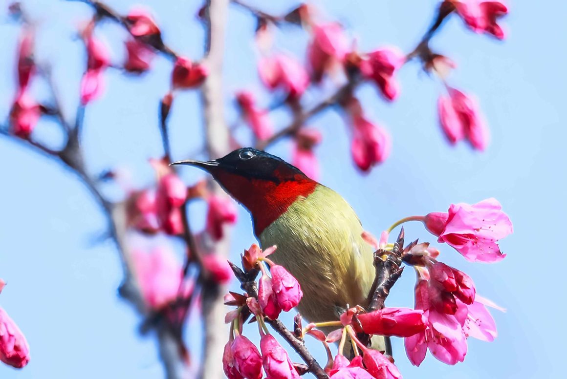 立春时节,小鸟在湖北秭归县茅坪镇望江公园的早樱枝头嬉戏。王罡摄(人民图片网)