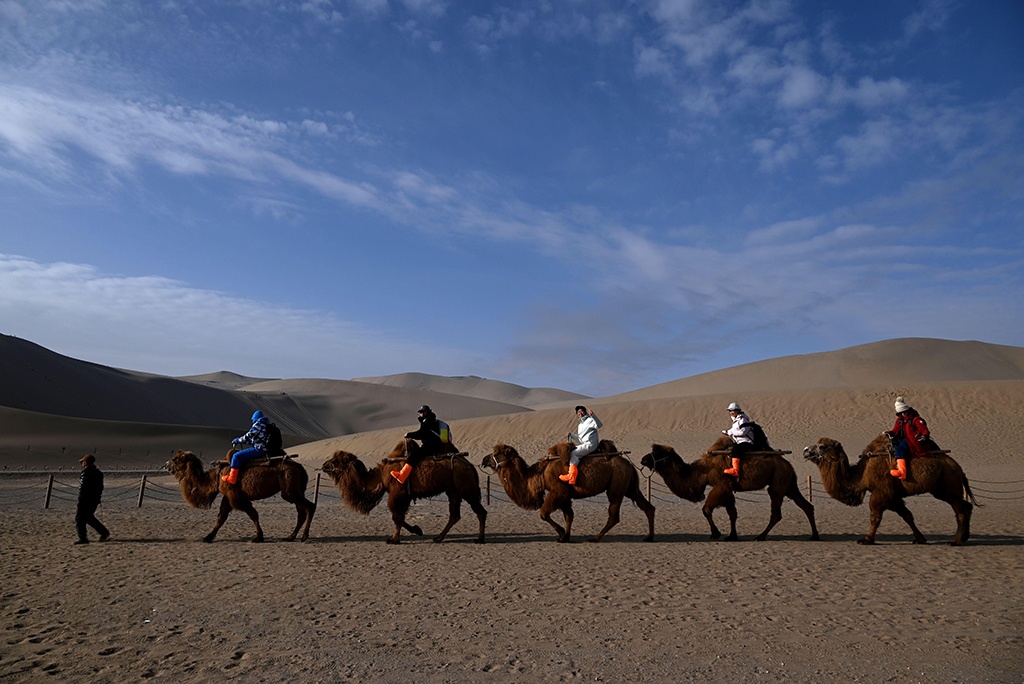春节假期,游客走进甘肃敦煌鸣沙山月牙泉景区,欣赏大漠风光,体验丝路风情,欢度新春佳节。张晓亮摄(人民图片网)