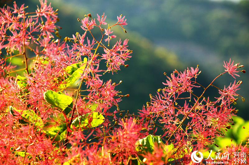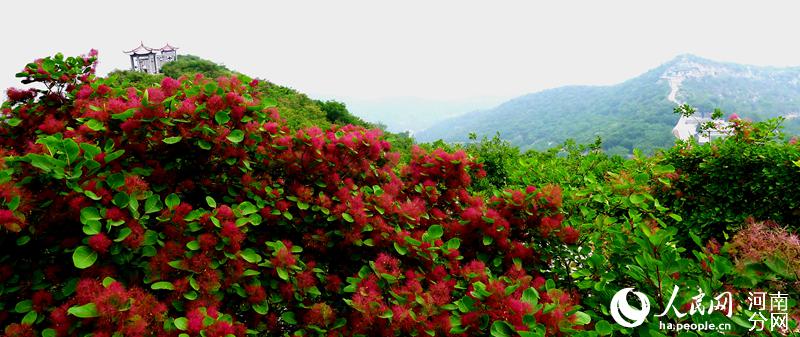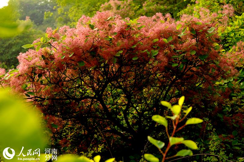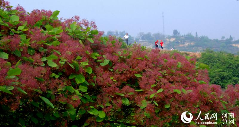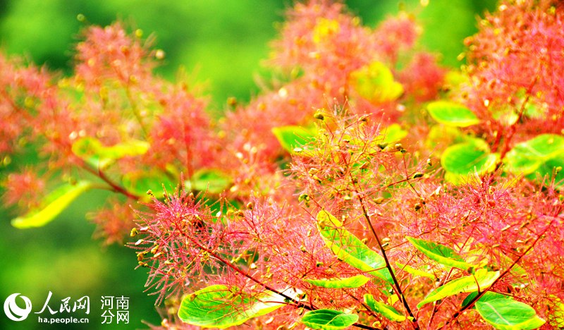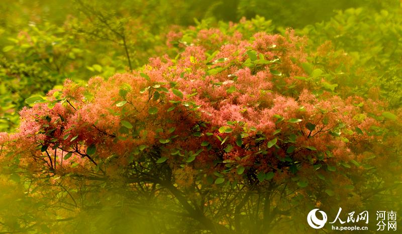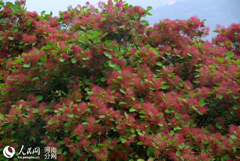 人民网郑州4月24日电 (黄莎)四月春光,花开时节。近日,河南巩义市竹林镇长寿山的黄栌树花开了,满山遍野,胜似火。黄栌吐蕊,渐渐盛开紫红色的绒花,一团团、一簇簇点缀在绿叶之上,近观如羽绒柔软,远观如烟似雾缭绕群山。