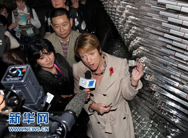 10月31日,英国环境、食品与农村事务大臣卡罗琳·斯佩尔曼拆下“种子圣殿”的第一根亚克力杆后接受采访。新华社记者凡军摄
