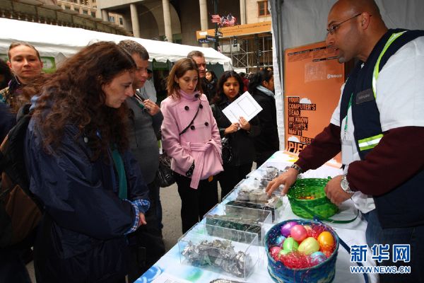 4月22日,在美国纽约大中央车站,工作人员向市民介绍电子垃圾的回收。新华社发(吴凯翔摄)