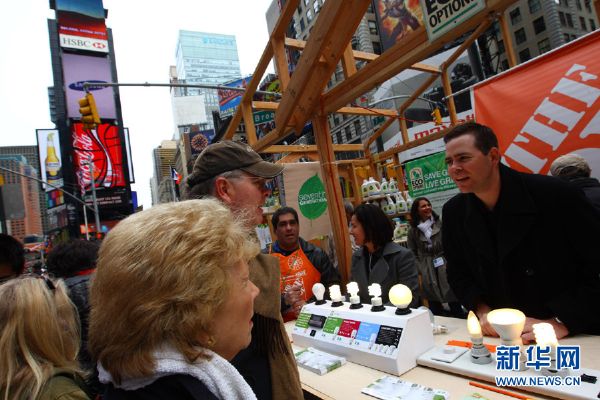 4月22日,在美国纽约时报广场,工作人员向市民介绍节能灯泡。新华社发(吴凯翔摄)